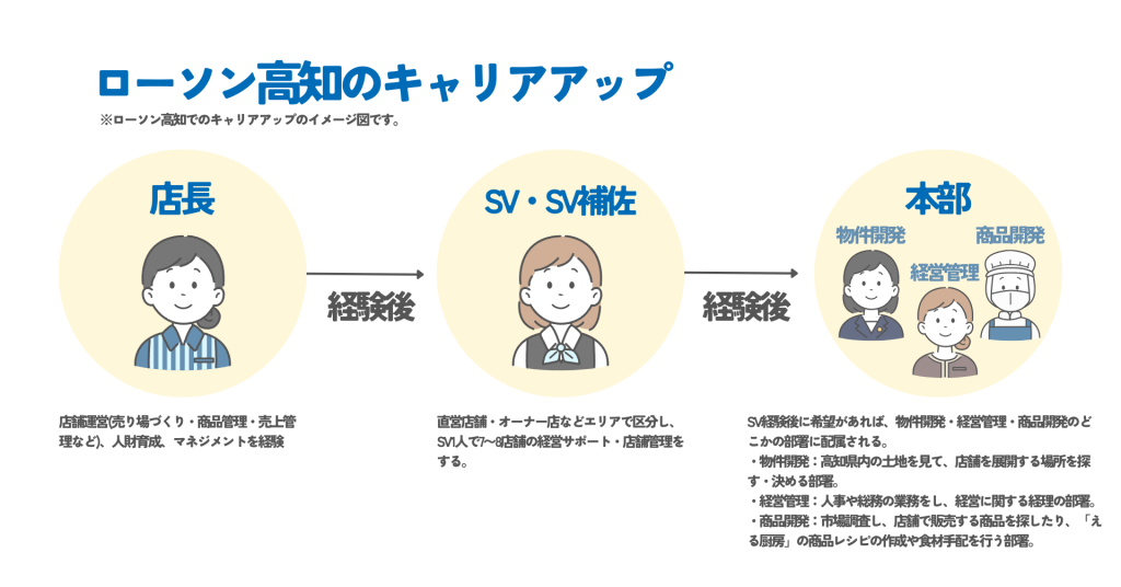 ローソン高知では、社員さまのキャリアアップに力を入れており、多くの社員さまが加盟店の経営サポートや運営のアドバイスを行うSV(スーパーバイザー)や、商品開発の部署などを目指して働かれています。