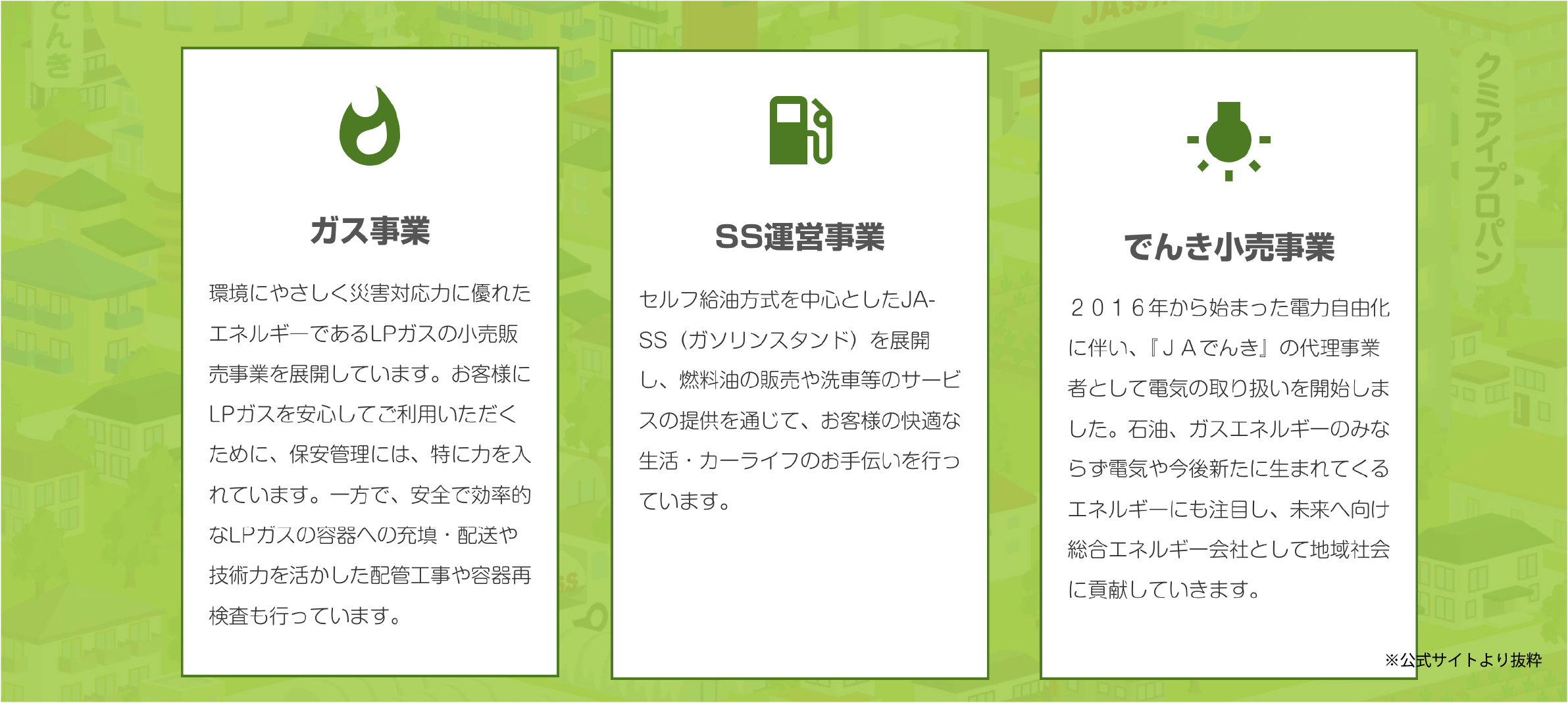 JA組合員様の電気料金を安くしたり、LPガスと一緒に契約するとお得になるセット割りの提案をしています。容器検査事業では、LPガス容器の検査を行っています。